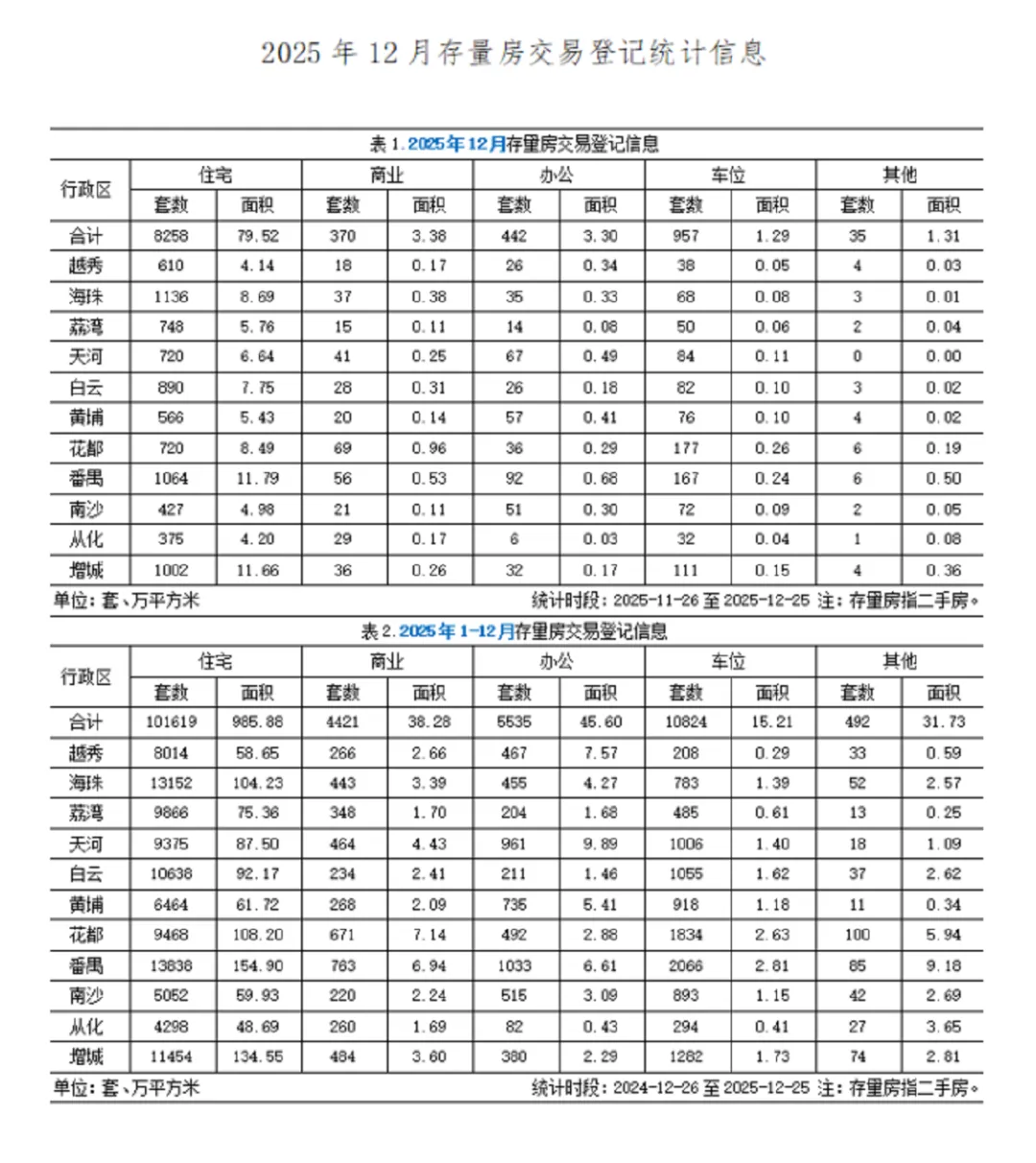 2025年1-12月,广州存量二手房累计网签101619套[同比涨幅5.84%](数据截止2025年12月25日)