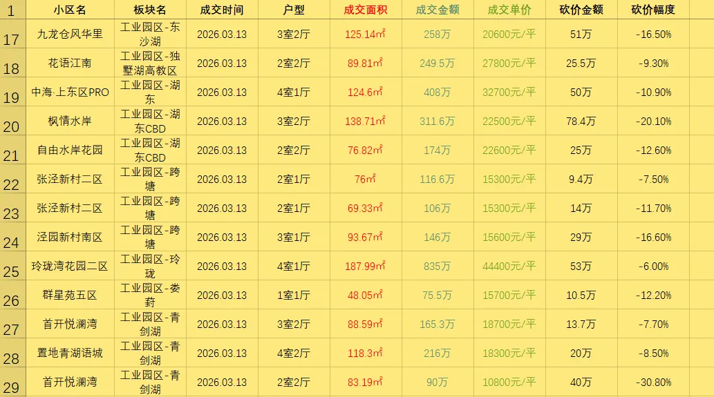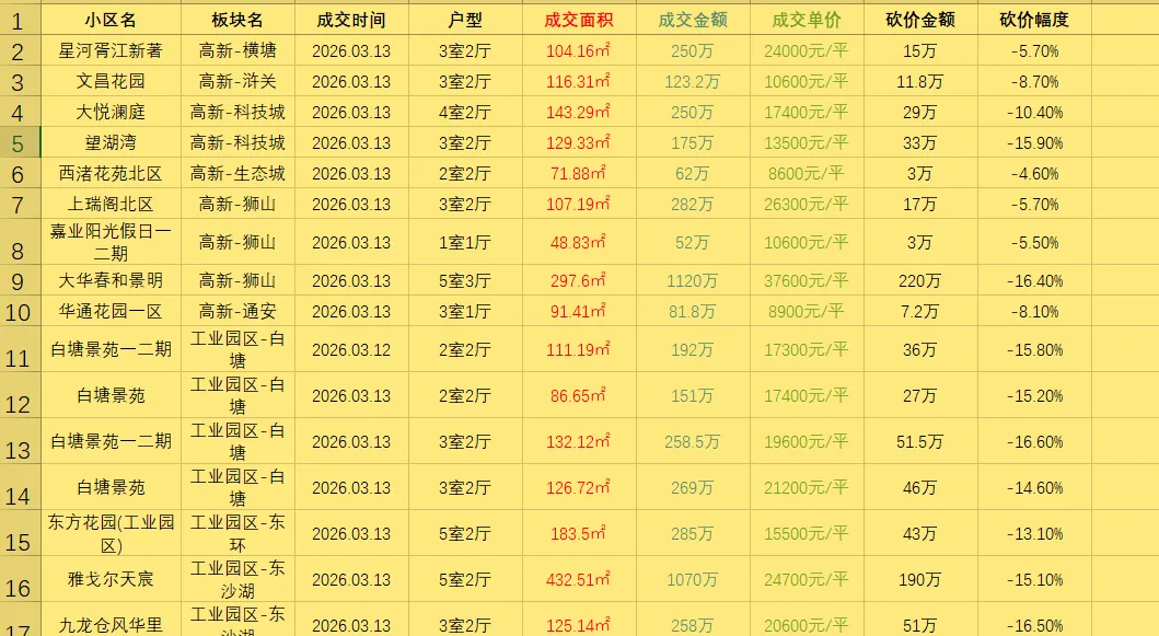 3.13号,苏州所有贝壳成交二手房真实成交价,高新区成交10套、工业园区成交20套、吴忠成交15套、相城成交14套。每天都会更新苏州二手房真实成交价。