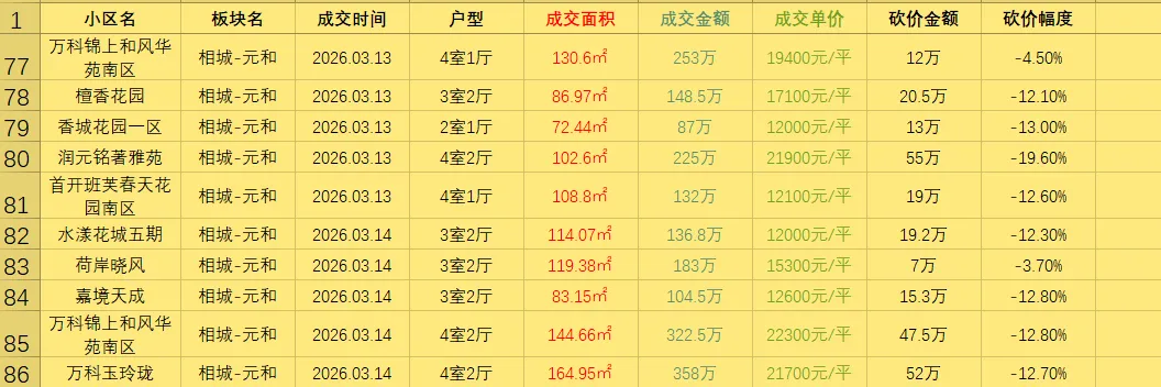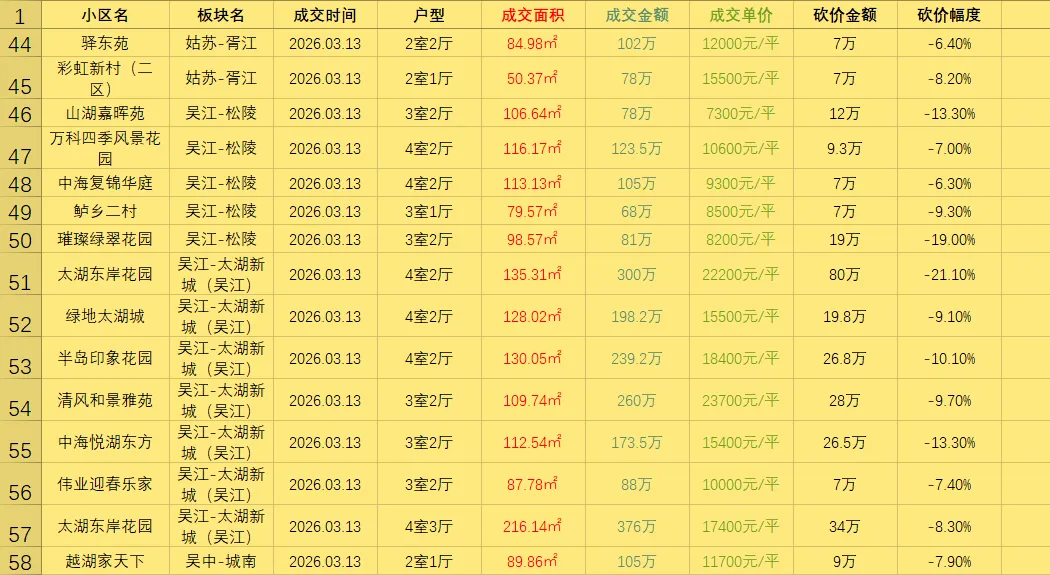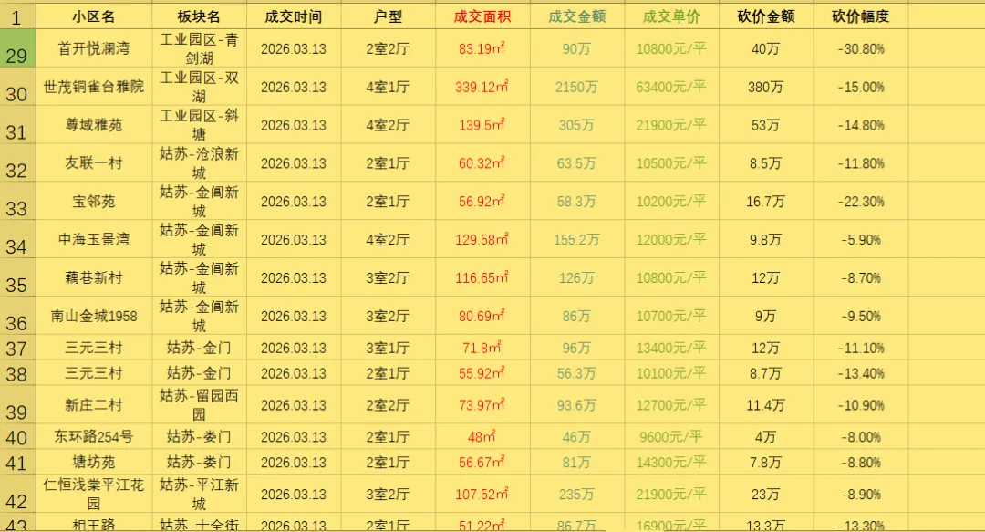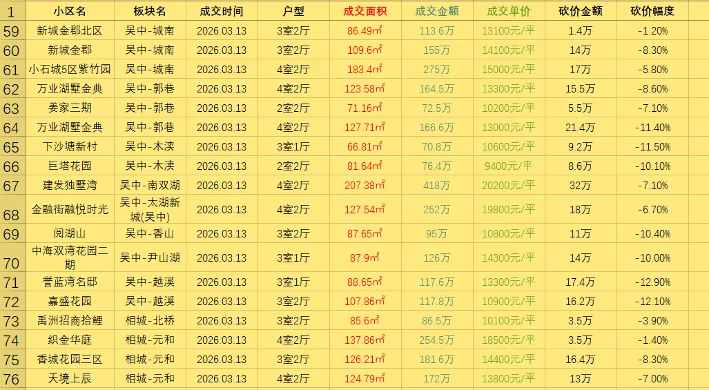 >3.13号苏州所有贝壳成交二手房真实成交价(共成交86套二手房),每天都会更新(按时间排序),给大家做个参考