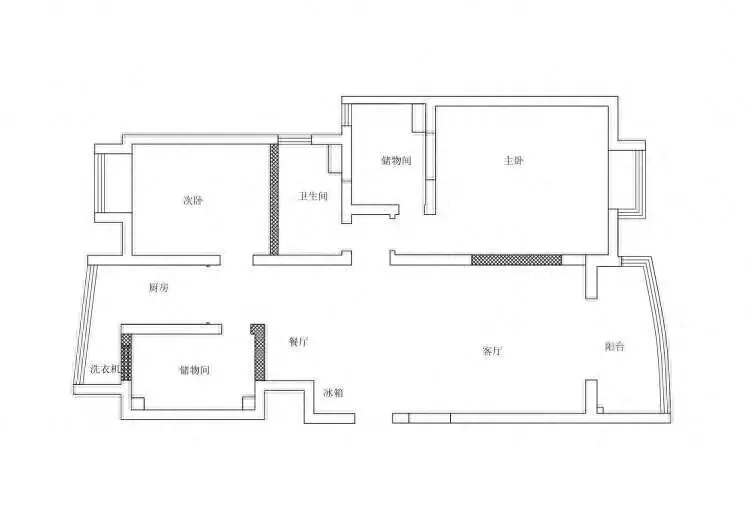 原始的隔墙图,户型中规中矩,但是还是有不少问题的。首先餐厅太小无法满足多人一起聚餐的需求,厨房因为储物间变得异形狭小,也阻挡了室内采光,还有就是卫生间太小,需要重新规划设计。