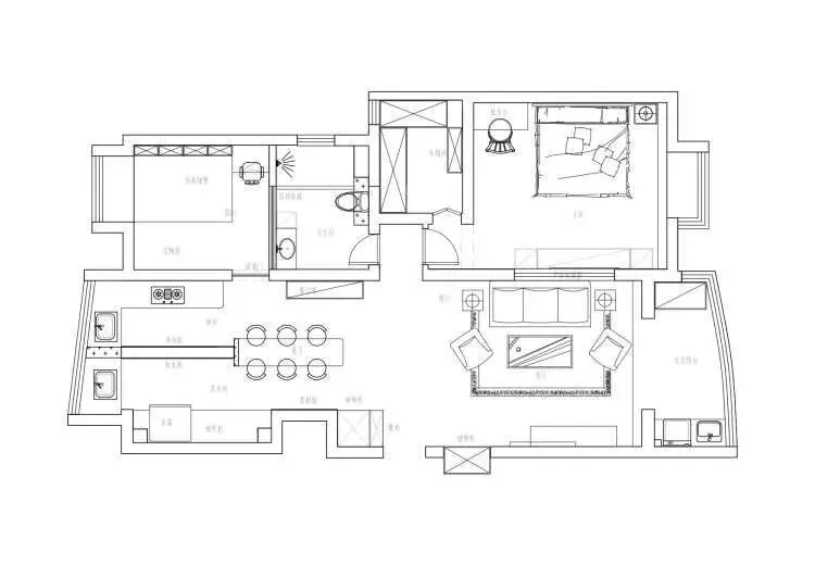 设计生化过的平面图,拆除部分非承重墙,借用部分次卧空间扩大卫生间。厨房拆除储物间,重新规划空间,利用墙体将厨房分隔成了中西两厨,新建与墙面等宽的吧台,充当餐桌使用,也满足聚会需求,同时也提高了室内采光。