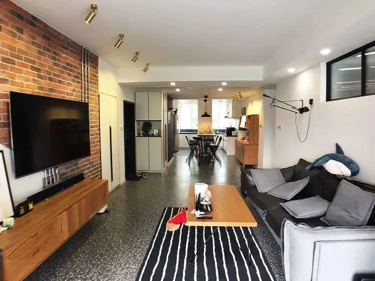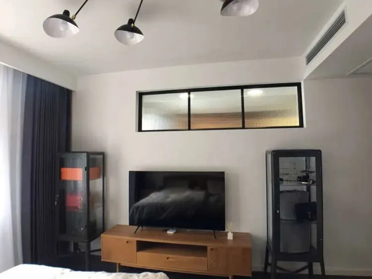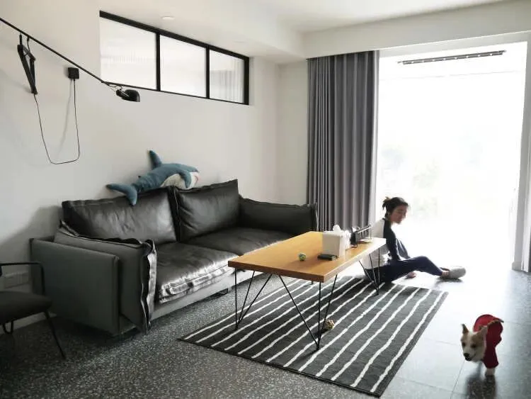 沙发墙顶部,用黑框艺术玻璃装饰,增加空间采光和通透感。拆除深色的木地板,换成了水磨石地砖,档次提高的不是一点点。