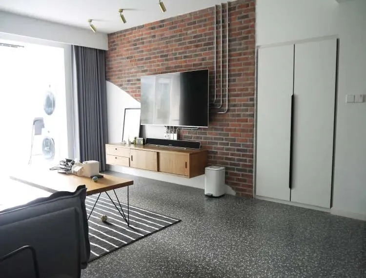 电视墙,用红砖文化石、破旧石膏墙,镀锌管装饰,形成了别具一格的艺术工业风效果。悬挂式电视柜,简易清洁方便。