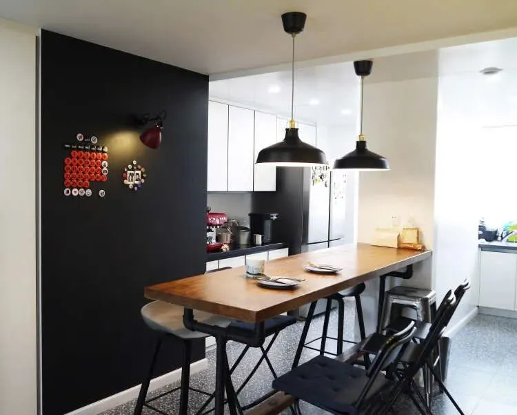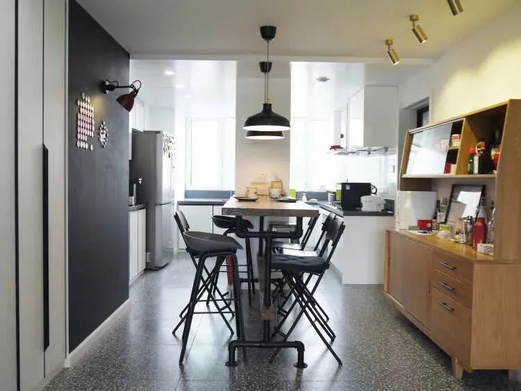 改造后的餐厨空间,整个空间都变得亮堂了。承重墙将厨房一分为二,中西厨结合彼此间不影响。家庭聚会的时候,增加主人和朋友之间的互动性。
