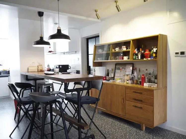 与承重墙等宽设计吧台,简易造型空间更显通透。2米长的吧台桌,满足了家庭聚会的需求。餐边柜容量很大,可以放置好多的瓶瓶罐罐,让收纳更井然有序。