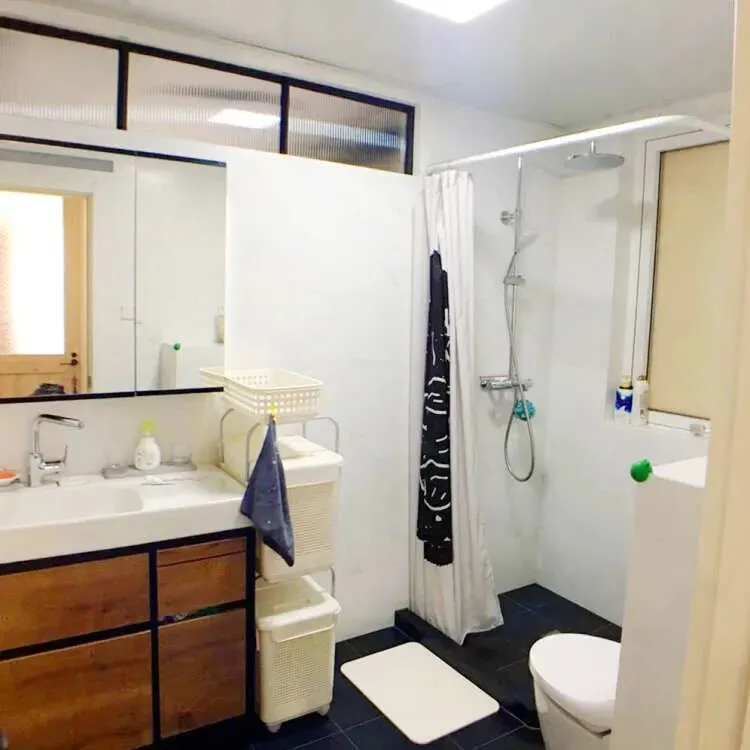 改造后,借用次卧空间扩大卫生间,增加了舒适度和采光。墙面和沙发墙一样,设计了一组艺术玻璃装饰,增加采光。