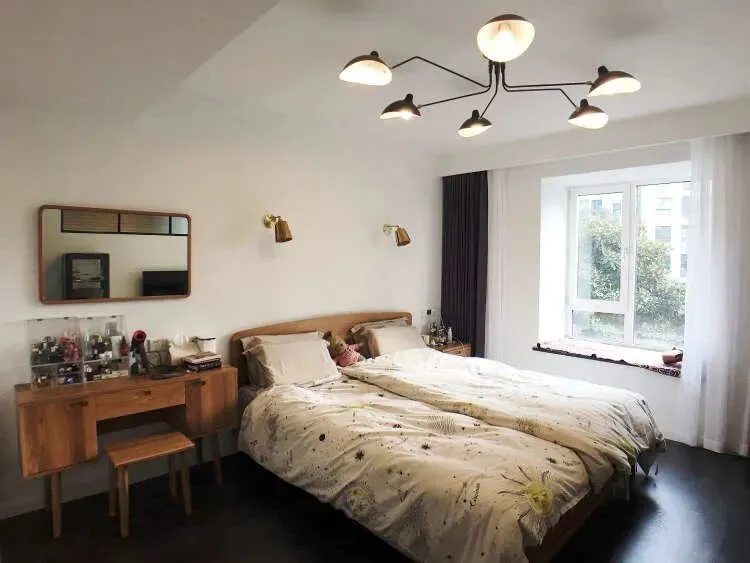 改造后卧室,重新调整布局,把梳妆台换到另一侧,拆除壁挂式空调换成中央空调,增加窗帘盒设计。软装一换效果截然不同。