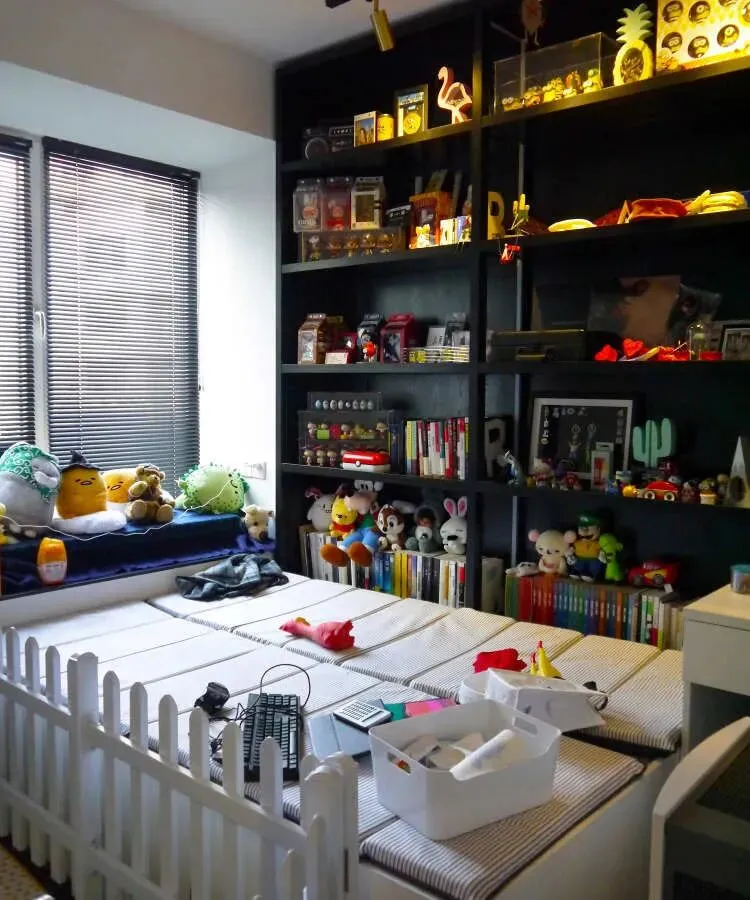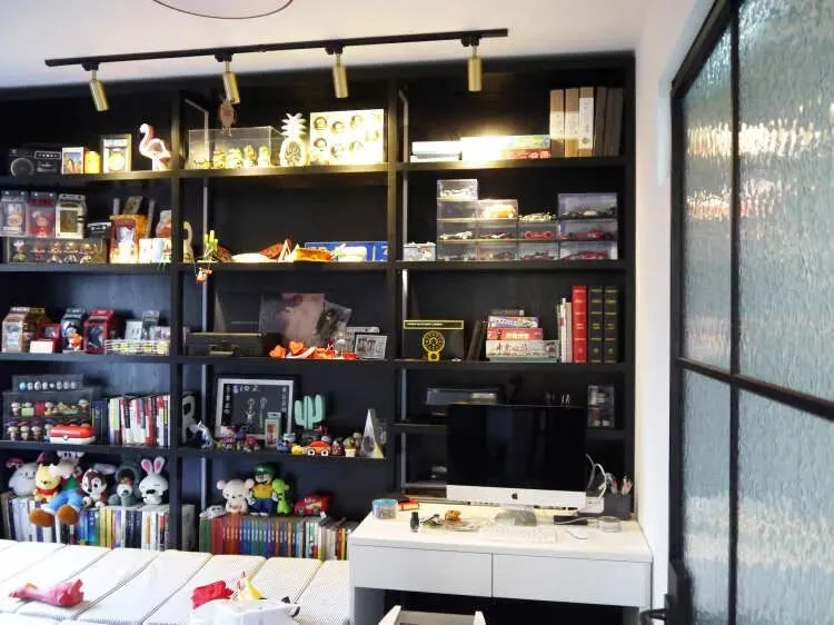 改造后次卧,休闲、办公两不误,增加了大面积的展示柜,摆放书籍、玩偶和模型。