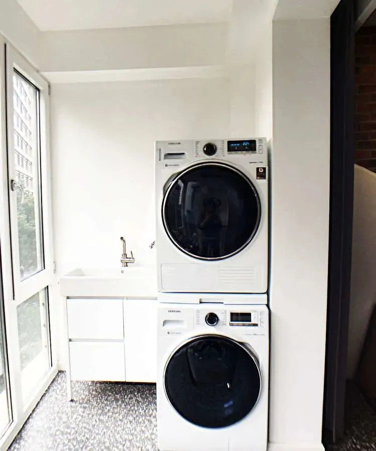 阳台非常简洁,洗衣机、干衣机叠放节省空间,小小的洗衣柜实用兼顾收纳,释放阳台空间。前后对比差距太大了,落地窗的视野和采光都很好。