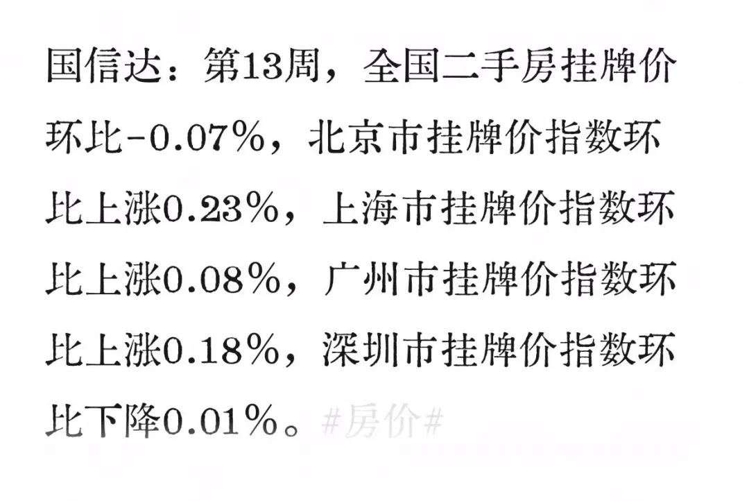 第13周全国二手房挂牌价微跌,北上广挂牌价指数逆市上涨