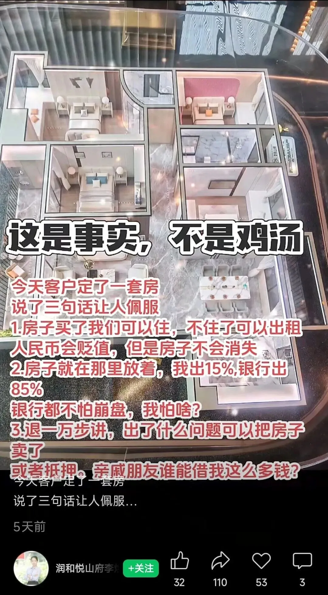 能说出这样的话,其心理动机就是典型的“屁股决定脑袋”。视频中提到的“天天喊跌的没买房,买了房的都懂”,这是典型的认知失调缓解机制。有些已经买房的人,为了缓解“资产缩水”的焦虑,会本能地寻找理由自我安慰,他们不会强调自己背负的月供压力,也不会承认如果现在卖房可能亏损的事实。