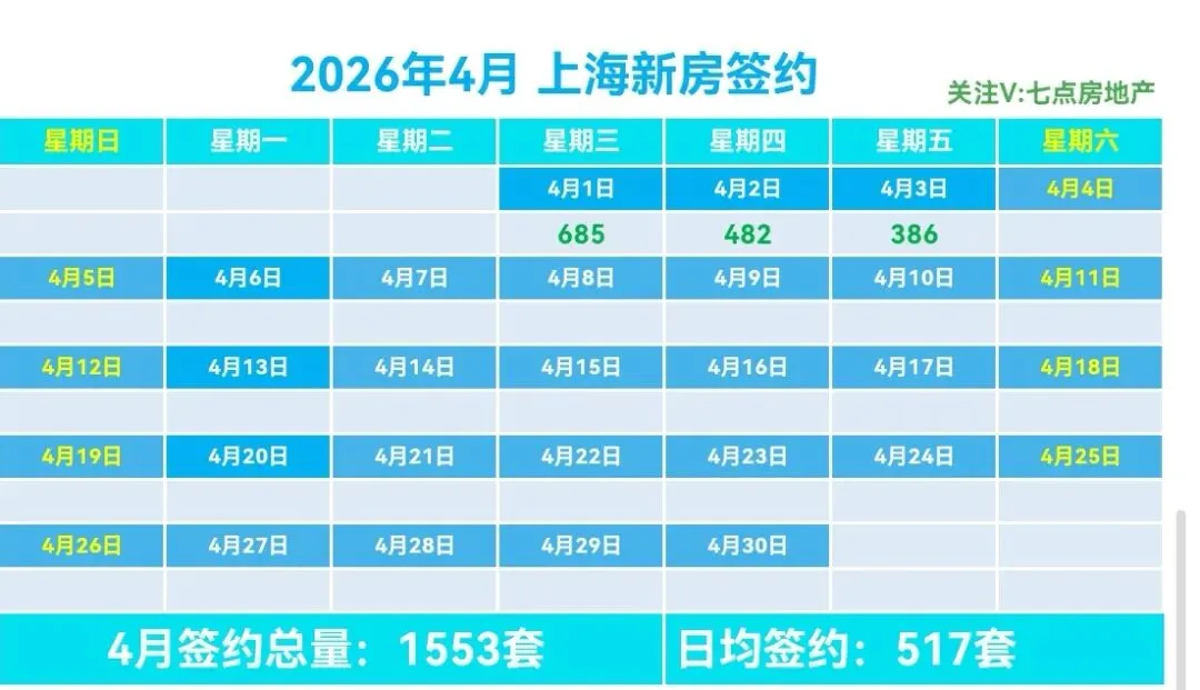 🏠4月上海新房总签约1553套,日均签约517套,本月签约总面积13.23万m²,套均面积90.78m²。