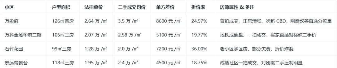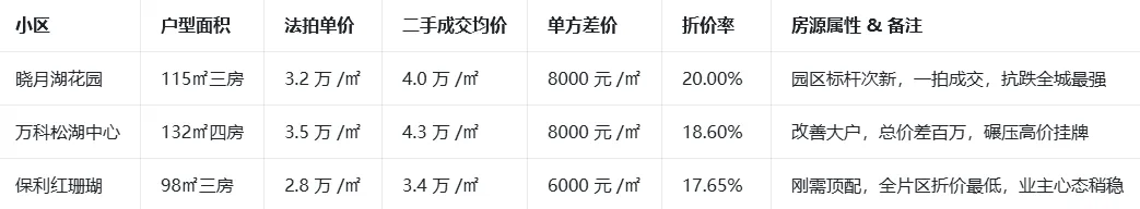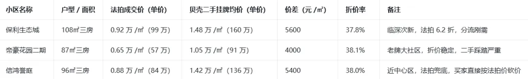 数据口径:法拍为阿里 / 京东司法拍卖已成交全款 + 按揭落地价;二手为贝壳同小区近期真实成交均价(非虚高挂牌)。