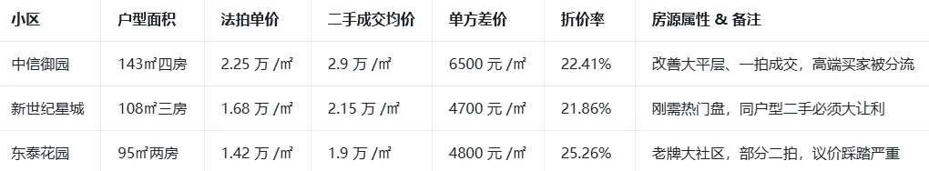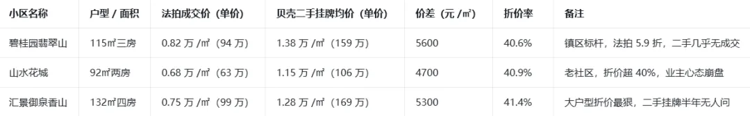 远郊(茶山 / 谢岗 / 樟木头)35%-42%(5.8-6.5 折),核心区(南城 / 东城 / 松山湖)18%-28%(7.2-8.2 折),远郊单套价差普遍50-80 万,是核心区的 1.5 倍以上- 流通性断崖:远郊法拍流拍率超 40%、二手去化周期超 18 个月;核心区法拍成交率 60%+、二手去化 8-12 个月 ,远郊业主想卖,只能跟着法拍价 腰斩式降价,否则彻底卖不掉。