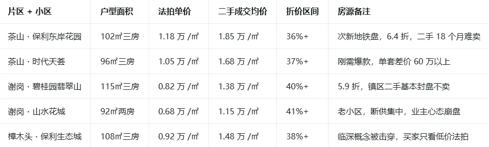 东莞茶山、谢岗、樟木头 3 个远郊镇区(2026 年 3-4 月最新)法拍成交价 vs 贝壳二手挂牌 / 成交均价的完整清单,折价普遍35%-42%,比核心区更狠,完全是 降维踩踏。