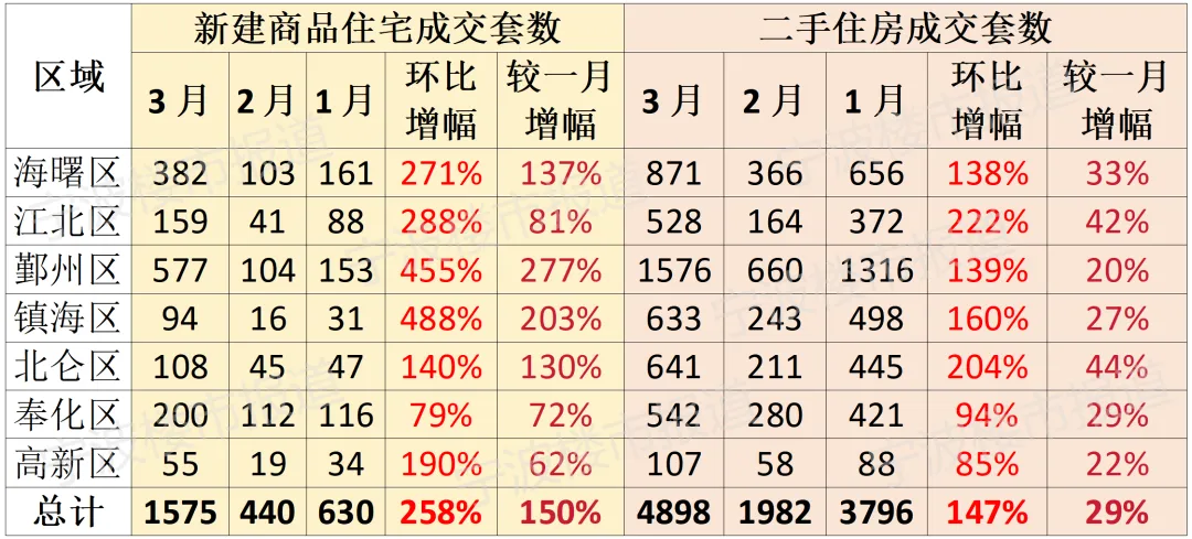 市区各地3月份新房、二手房的成交量,环比增幅都非常大,与1月份相比也都是一片红!