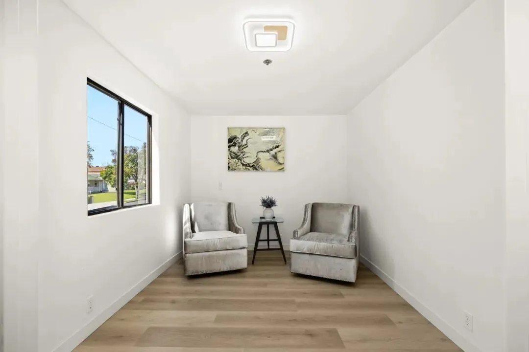 **私密户外空间:宽敞的客厅带推拉门通向一个私密、带围栏的庭院,适合放松或户外用餐。