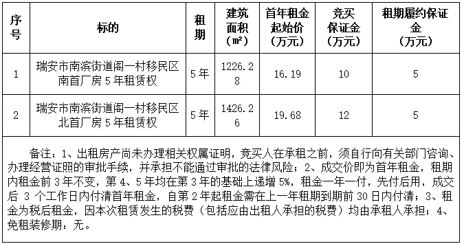 三、竞买对象:有效存续1年及以上的企业法人或个体工商户(竞买人资格须经瑞安市南滨街道阁一村经合社审核)