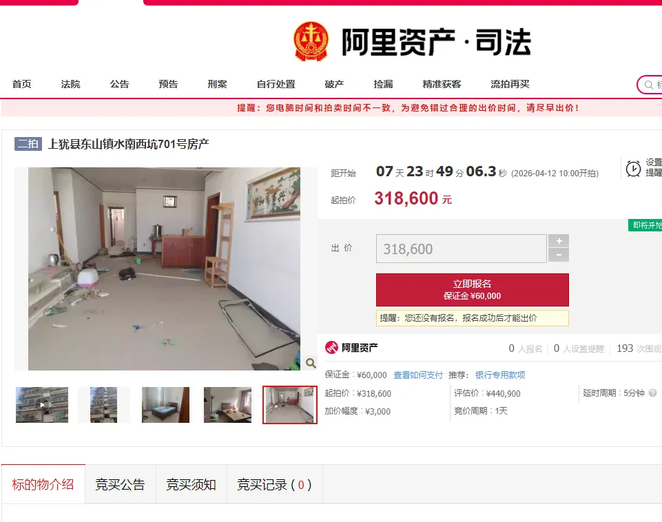 上犹县人民法院将于2026年4月12日10时至4月13日10时,在淘宝网司法拍卖平台对上犹县东山镇水南西坑701号房产进行公开拍卖(二拍)。拍卖标的为:不动产权证号赣(2020)上犹县不动产权第0069105号,房屋总楼层为7层,拍卖住房位于第7层,规划用途为住宅,建筑面积116.26平方米,平面布局较合理,三室两厅两卫,已装修,该房产现被上犹县人民法院查封,评估价为44.09万元,起拍价31.86万元,保证金6万元,增价幅度3000元。来源:阿里拍卖