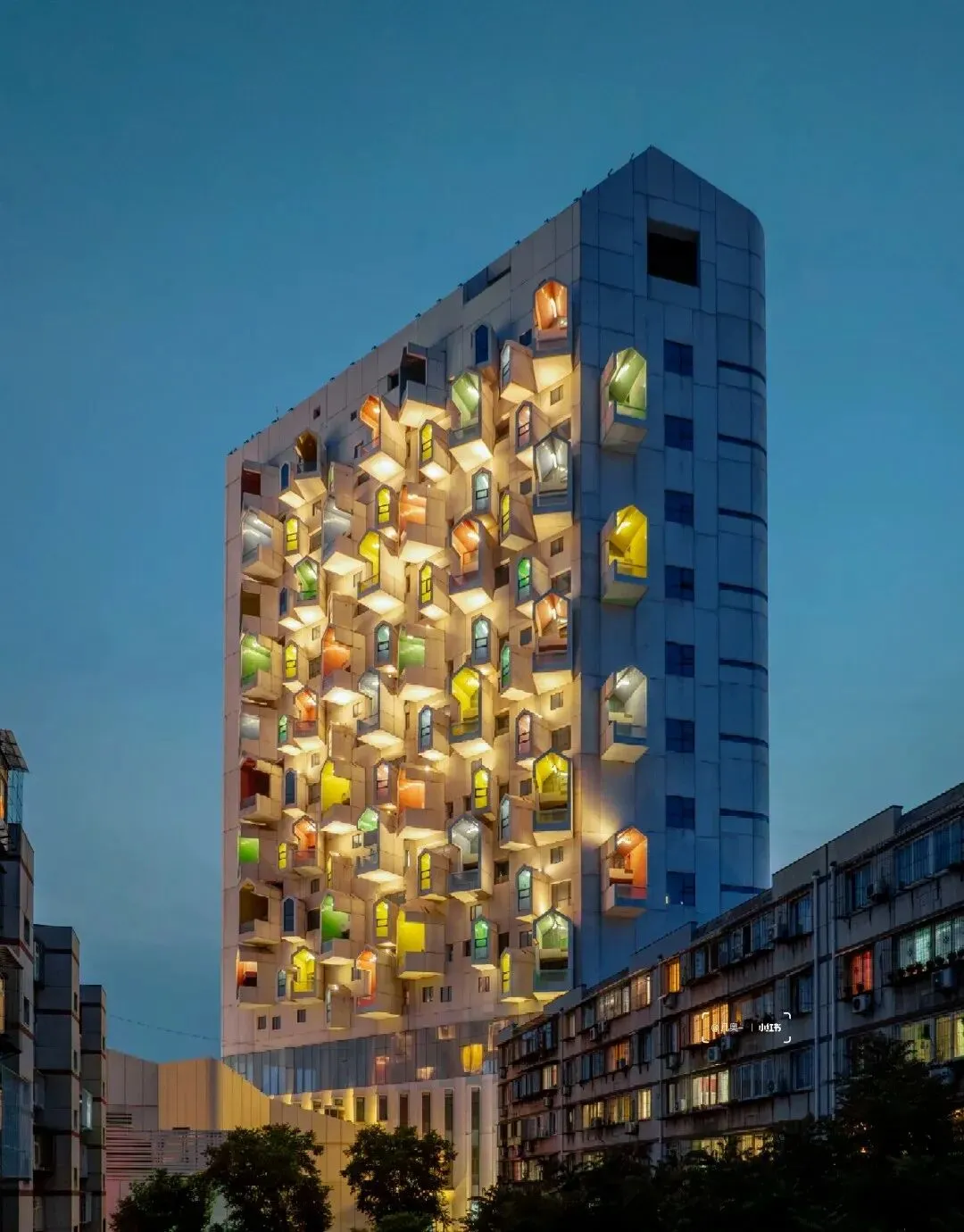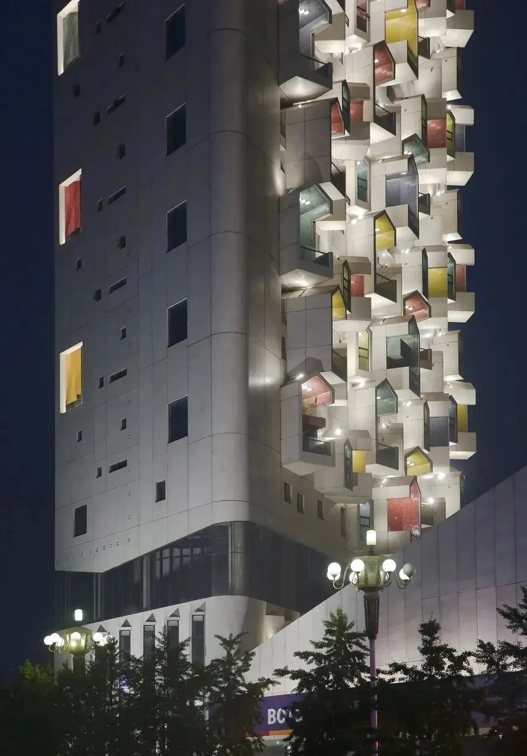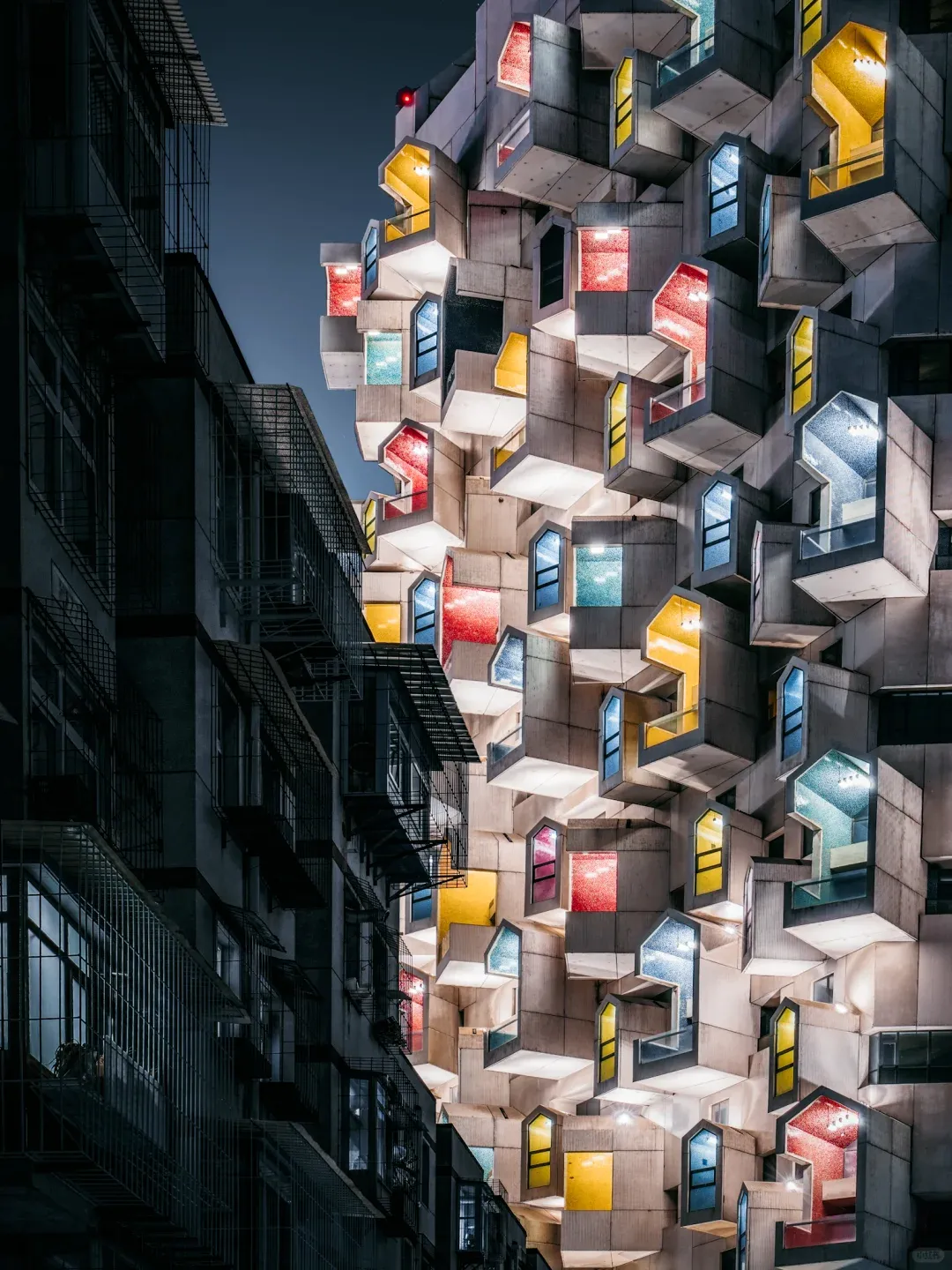 看上去平平无奇,甚至在周围的环境中,显得有点另类。但随着夜幕降临,灯光开启,它似乎就开启了赛博朋克模式。