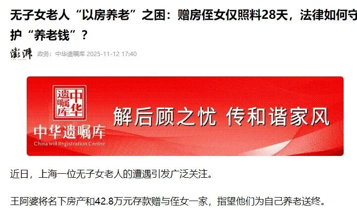 上海的王阿婆,婚后未生育子女,丈夫去世后独自生活。为解决养老难题,她与侄女王女士一家达成口头协议:将自己名下的房产和42.8万元存款赠与对方,由他们负责养老送终。