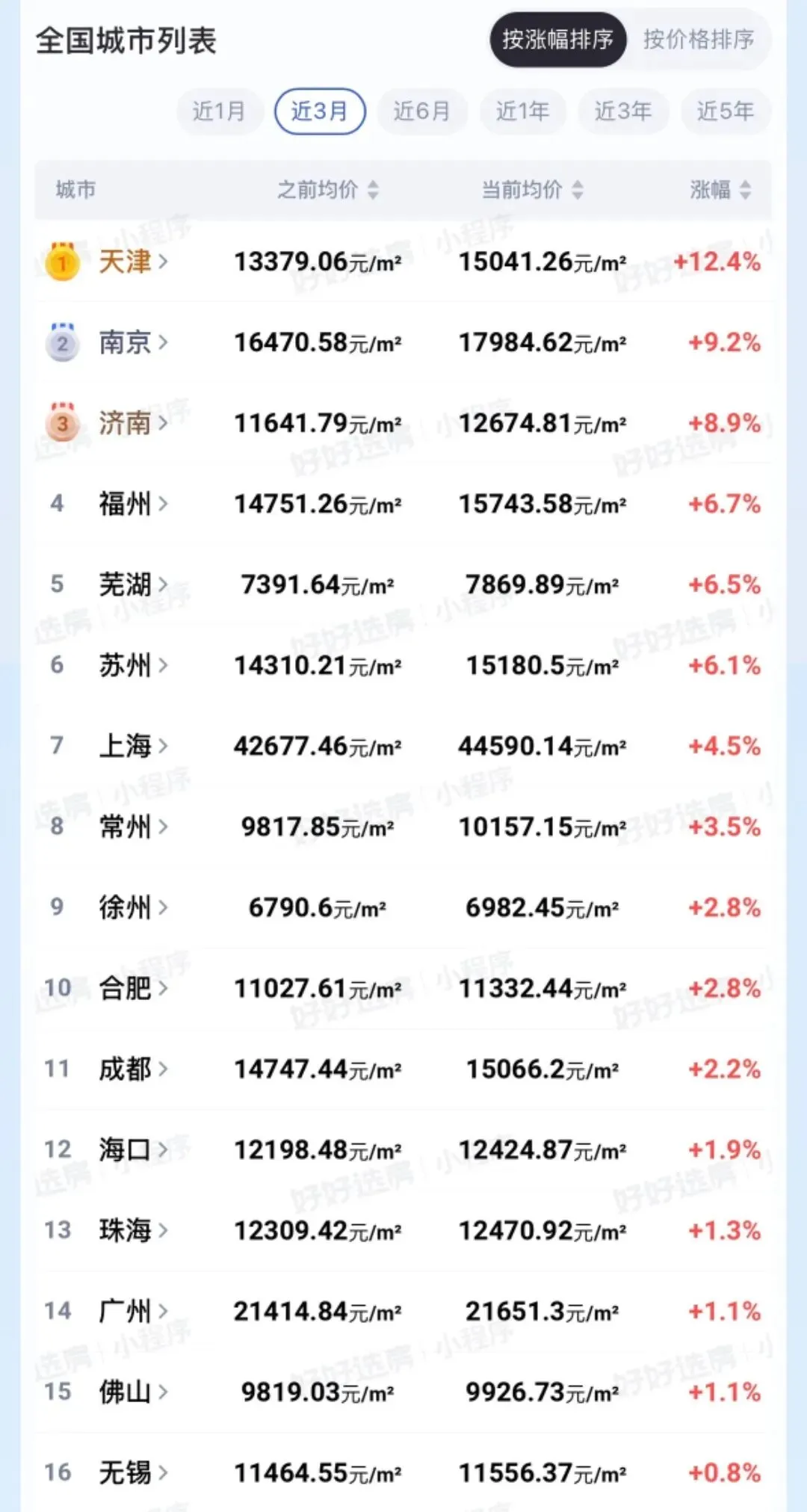 与此同时,天津、南京、济南、福州等一二线省会城市,房价近3个月皆迎来明显涨幅。