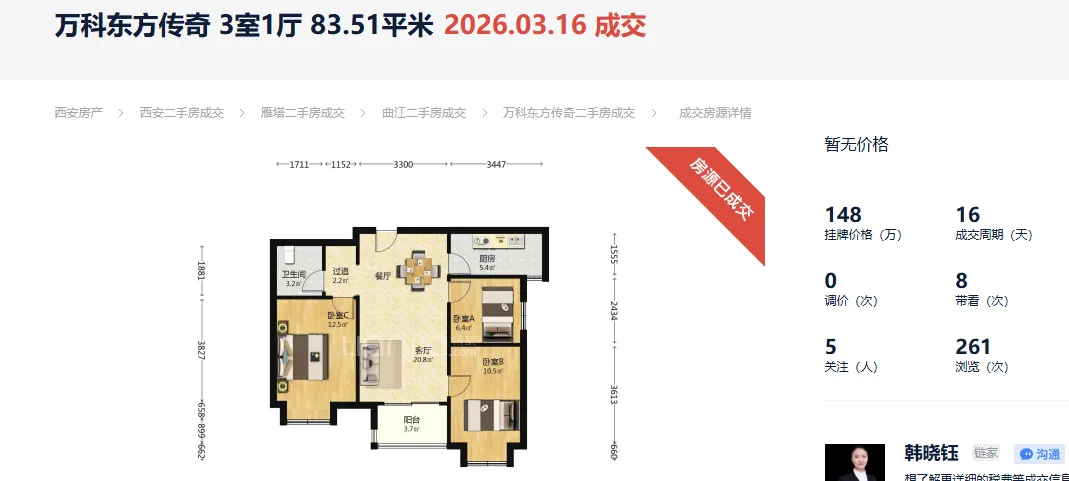 曲江万科东方传奇,一套83.51㎡两室 ,总价148万,8组带看,成交周期仅16天。