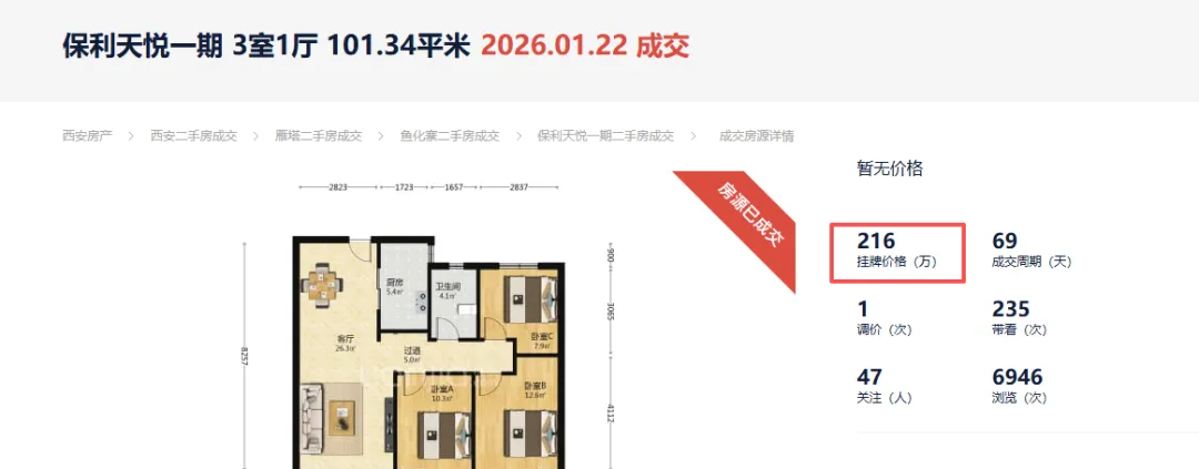 同样处于高新区的保利天悦一期,一套建面约101.34平的三室,1月22日以216万元成交。