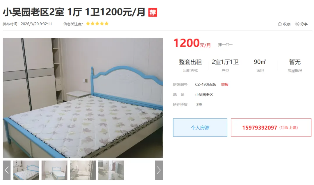 【德兴房产】个人房源,小吴园老区2室 1厅 1卫1200元/月,精装修俩室