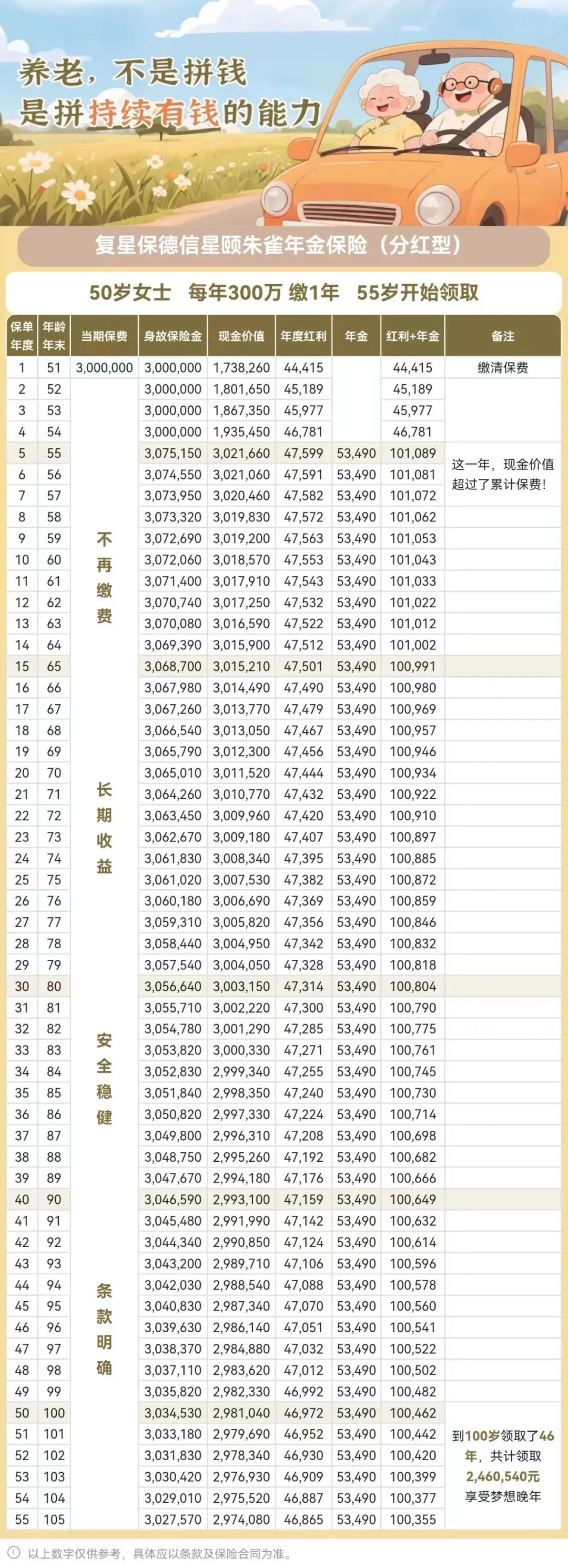 *资产传承:如果在100岁身故,还有约303万元的身故金,通过指定受益人,免税、无争议地传承给孩子。根据保险法,这笔钱不属于遗产,免征遗产税,且属于子女的个人财产,与其配偶无关。
