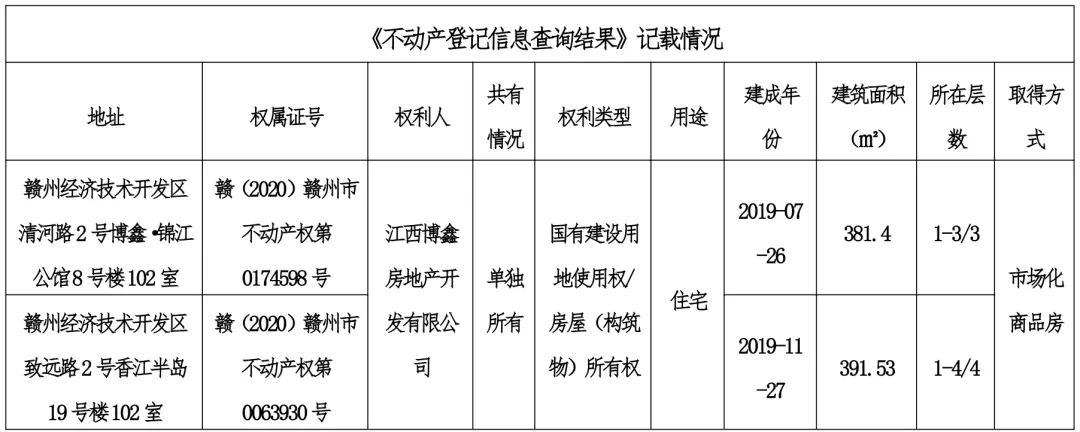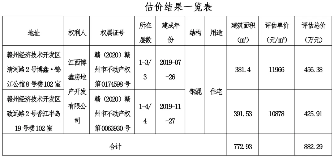 ▲ 赣州博鑫房地产名下2套拍卖房源评估信息