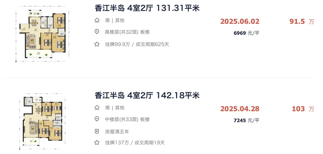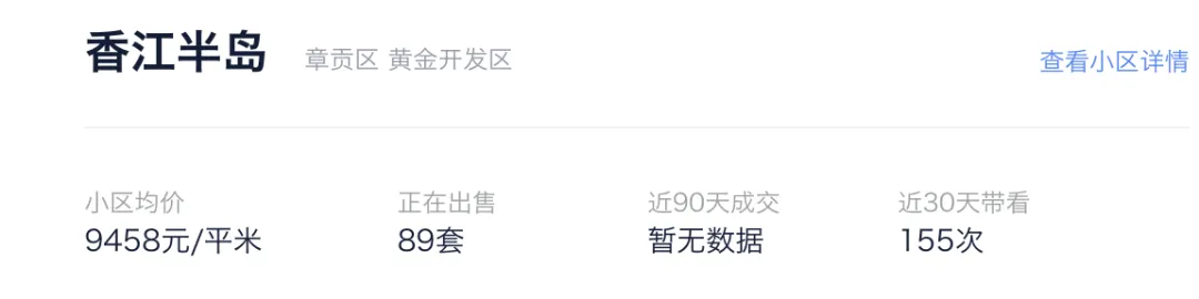 我们查阅了香江半岛在贝壳平台的二手成交信息。目前,小区有 89 套房源在售,小区挂牌均价 9458 元/㎡。