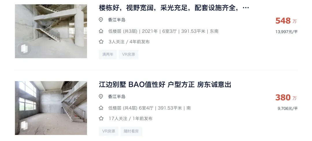 另外一套来自香江半岛的别墅就没这么幸运了!这是一套双拼别墅,2019 年建成,登记时间为 2020 年 6 月 29 日,建筑面积为 391.53㎡,总层数 4 层,毛坯状态,评估价 425.91 万。