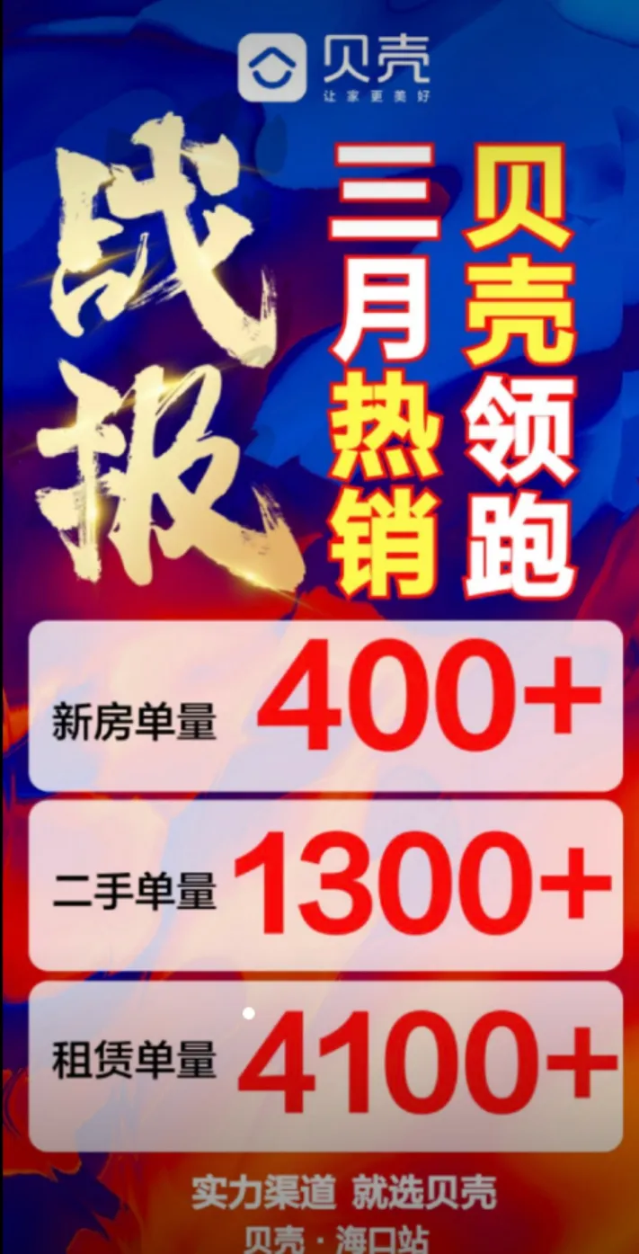 而贝壳官方视频号布的一则海报更震撼:3月份海口2二手房成交量达到1300套以上(包含澄迈100套左右)!租房市场方面,达到4100单+,小易咨询了几位中介朋友,往年“金三银四”,单月租赁量大约在1500-2000单左右,暴涨一倍以上。