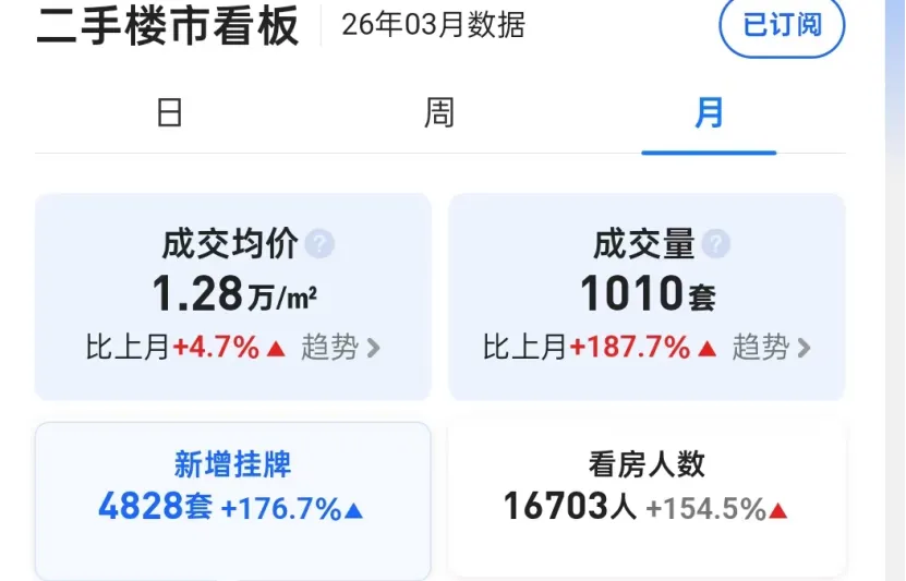 再带2026年,一月份出现740套的短暂冲高之后,受春节假期传统二手淡季影响,迅速跌落到356套,直到3月市场强劲反弹,创下新高!