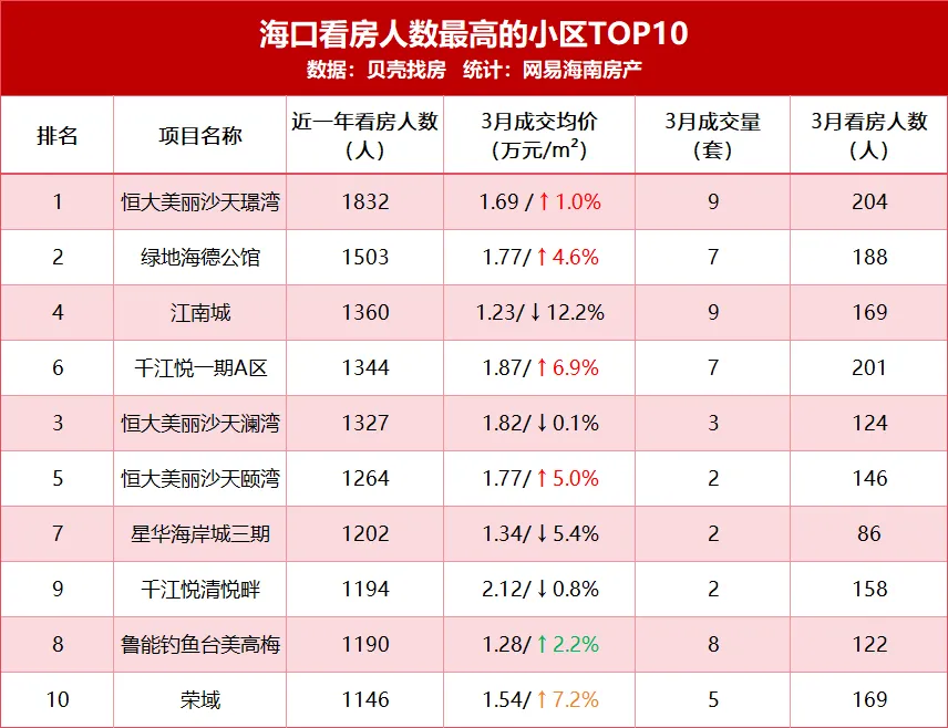 此外,绿地海德公馆(近一年1503人、3月188人)、江南城(近一年1360人、3月169人)、千江悦一期A区(近一年1344人、3月201人)等品质社区持续上榜,印证了“优质资产=学区/品牌/海景+合理价格”的市场逻辑:这类项目要么依托名校资源(如绿地海德公馆、江南城),要么兼具品牌口碑与景观优势(如千江悦、恒大美丽沙),在价格企稳后更易获得购房者青睐。