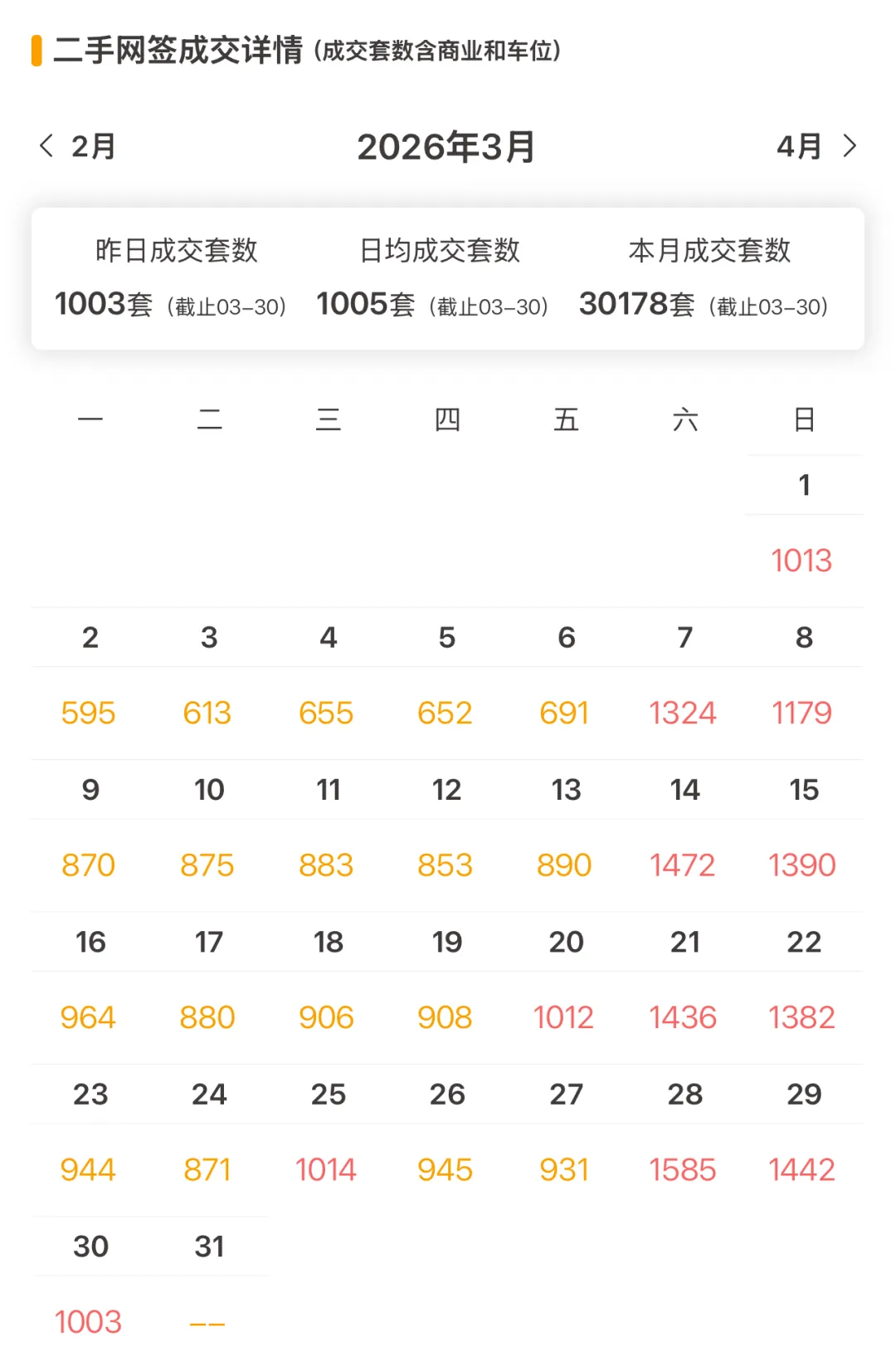 上海二手房最新成交量:昨日(3月30日)网签1003套(含住宅、商业、车位等)。
