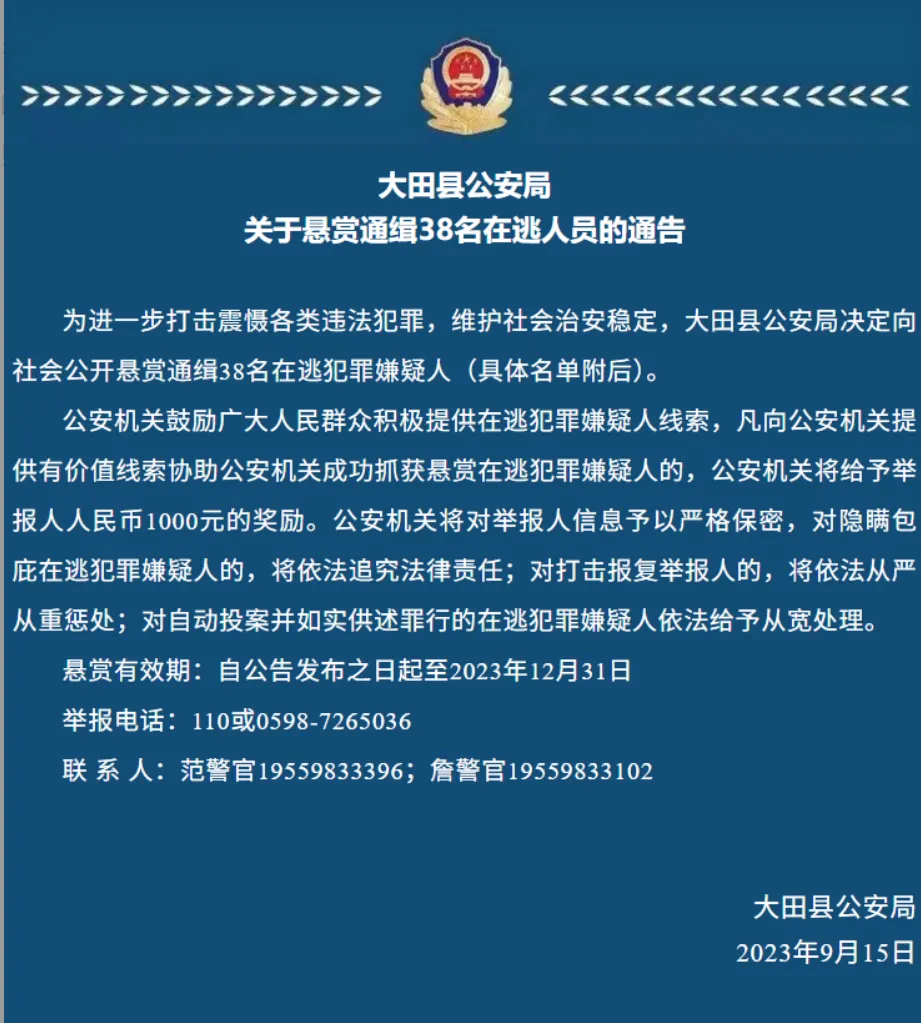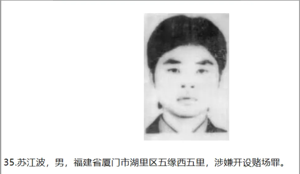 而就在他开始大手笔购入后,2023年9月15日,大田县公安局便发布一份包含其照片及住址的通缉令,将其列为“在逃犯罪嫌疑人”。该份名单包括苏江波在内的38名涉嫌参与非法赌博、诈骗和网络犯罪等罪行的疑犯。