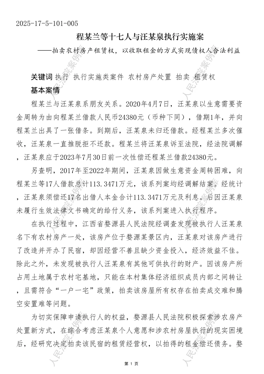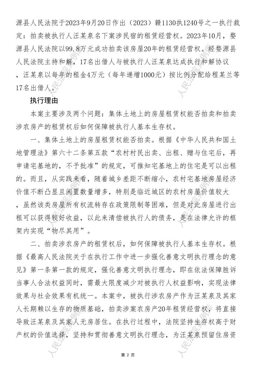 案例名称:程某兰等十七人与汪某泉执行实施案——拍卖农村房产租赁权,以收取租金的方式实现债权人合法利益