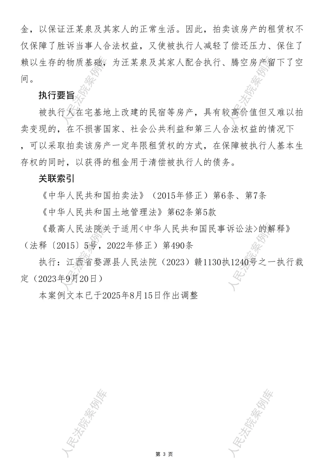 执行要旨:被执行人在宅基地上改建的民宿等房产,具有较高价值但又难以拍卖变现的,在不损害国家、社会公共利益和第三人合法权益的情况下,可以采取拍卖该房产一定年限租赁权的方式,在保障被执行人基本生存权的同时,以获得的租金用于清偿被执行人的债务。