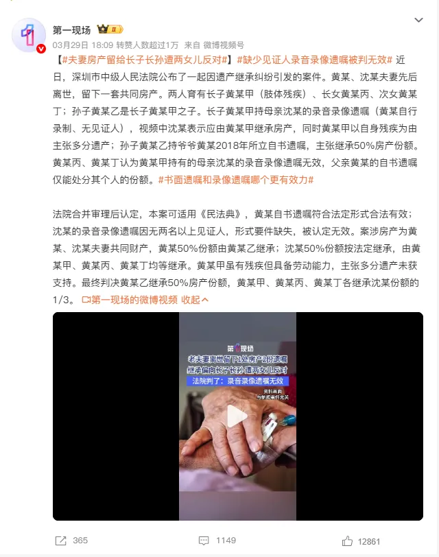 两个女儿则认为视频遗嘱无效,父亲的遗嘱只能处分他自己的份额。