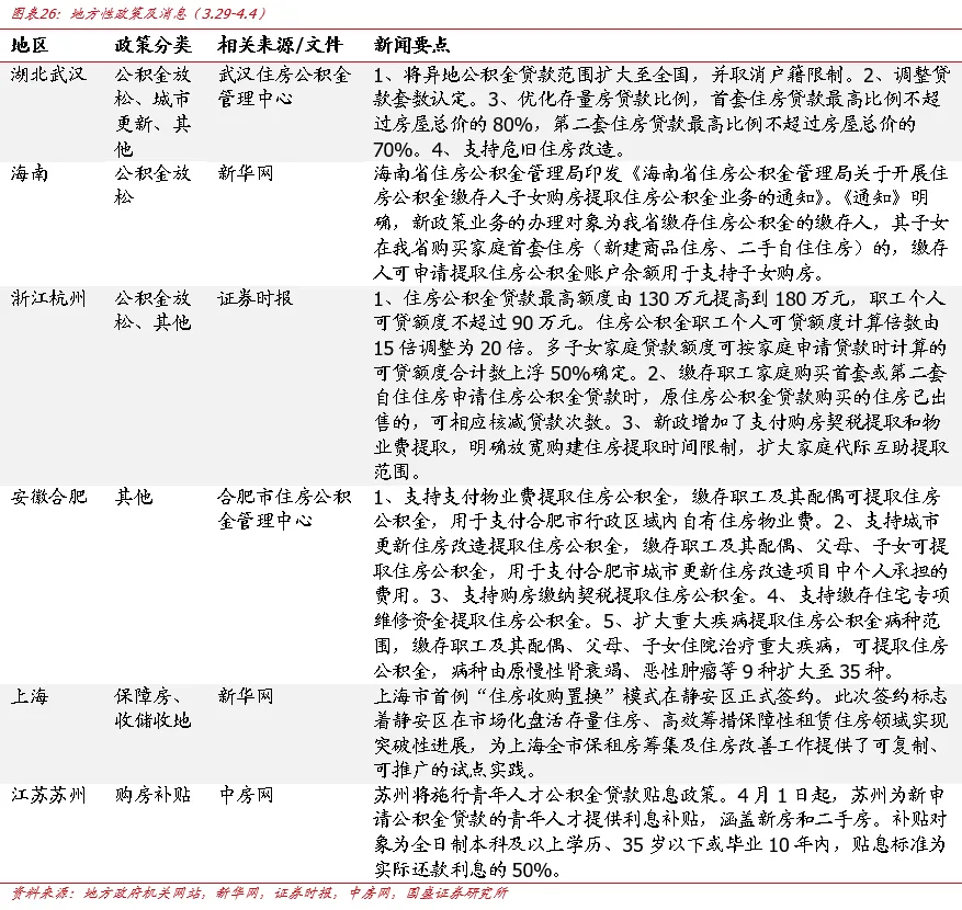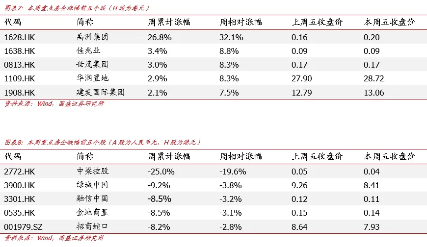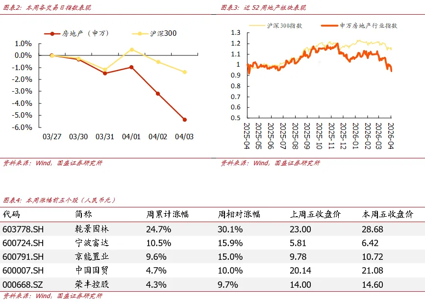 一季度土地市场在较低基数上继续负增,核心地段现少量高溢价成交地块。据中指数据,2026年1-3月(截至3月28日),300城住宅用地供应规划建面6472万平方米(同比-23.8%);成交5893万平方米(同比-25.9%);土地出让金2154亿元(同比-45.7%),均在较低基数上继续负增。房企拿地维持谨慎,仍有拿地能力的房企拿地策略趋同,即追求核心城市核心地段的确定性,也因此土地市场延续高度分化的格局。一方面,一季度部分核心城市也出现多轮竞拍、高溢价的土地出让,包括广州马场一期地块(243轮竞价,由越秀地产以236.04亿元竞得,溢价率26.6%)、杭州上城区城东新城地块(109轮竞价,由保利以32.2亿元竞得,溢价率51%)。另一方面,TOP100房企拿地总金额为1465.2亿元(同比-49.4%),与300城出让金一致,在较低基数上继续负增,整体来看全国土地市场依然疲弱。行情回顾:本周申万房地产指数累计变动幅度为-5.4%,落后沪深300指数4.00个百分点,在31个申万一级行业排名第29名。新房:本周30个城市新房成交面积为301.1万平方米,环比提升31.3%,同比下降5.6%,其中样本一线城市的新房成交面积为111.3万方,环比+103.7%,同比+57.9%;样本二线城市为128.7万方,环比+2.7%,同比-8.3%;样本三线城市为61.1万方,环比+23.6%,同比-43.5%。从今年累计13周新房成交面积同比看,样本30城共计1841.7万方,同比-26.5%;一线城市为538.7万方,同比-14.5%;二线城市为912.3万方,同比-22.0%;三线城市为390.7万方,同比-44.5%。二手房:本周15个样本城市二手房成交面积合计248.5万方,环比下降3.8%,同比下降4.1%。其中样本一线城市的本周二手房成交面积为114.9万方,环比-1.7%;样本二线城市为100.4万方,环比-5.5%;样本三线城市为33.2万方,环比-5.8%。信用债: 根据wind统计数据,本周(3.30-4.5)共发行房企信用债3只,环比减少11只;发行规模共计24.50亿元,环比减少78.51亿元,总偿还量209.57亿元,环比增加57.71亿元,净融资额为-185.07亿元,环比减少136.22亿元。投资建议:维持行业“增持”评级。我们认为重点关注房地产相关股票有以下理由:1、政策受基本面倒逼进入深水区,如我们2022、2023年在报告中反复阐述,认为本轮最终政策力度超过2008、2014年,而现在尚在途中。2、地产作为早周期指标,具备指向性作用,配置地产相当于配置经济风向标。3、行业竞争格局改善逻辑依旧适用,拿地和销售表现优异的依然是头部国央企和少量混合所有制及民企,品质房企有望在未来的格局中更加受益。4、我们观点“只看好一线+2/3二线+极少量三线城市”依然奏效,这个城市组合在销售前期偶尔反弹时表现更好也得到了印证。5、供给侧政策,收储、妥善处置闲置土地等政策有新变化,依然是观察落地最重要的方向,且可以预见,一二线仍然更受益。基于以上,我们认为2026年仍然是以政策为核心主导力量,板块反复做政策beta,配置方向可选:(1)地产开发:H股的绿城中国、建发国际集团、华润置地、越秀地产、中国海外发展、中国金茂;A股的滨江集团、招商蛇口、建发股份、保利发展、华发股份;(2)地方国企/城投/化债:城投控股、城建发展;(3)中介:贝壳-W;(4)物业属于跟涨:华润万象生活、招商积余、绿城服务、保利物业、中海物业等。风险提示:政策落地不及预期、需求复苏不及预期、房企出险风险蔓延。