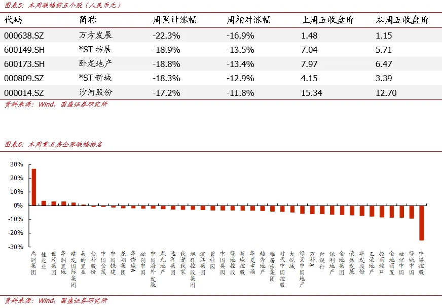本周申万房地产指数累计变动幅度为-5.4%,落后沪深300指数4.00个百分点,在31个申万一级行业排名第29名。本周上涨个股共14支,较上周减少40支,下跌股数为100支。本周市场上房地产股涨幅居前五的为乾景园林、宁波富达、京能置业、中国国贸、荣丰控股,涨幅分别为24.7%、10.5%、9.6%、4.7%、4.3%。跌幅前五为万方发展、*ST坊展、卧龙地产、*ST新城、沙河股份,跌幅分别为-22.3%、-18.9%、-18.8%、-18.3%、-17.2%。本周重点40家A/H房企中共计上涨6支,较上周减少1支,涨幅位居前五的为禹洲集团、佳兆业、世茂集团、华润置地、建发国际集团,涨幅分别为26.8%、3.4%、3.0%、2.9%、2.1%。跌幅前五为中梁控股、绿城中国、融信中国、金地商置、招商蛇口,跌幅分别为-25.0%、-9.2%、-8.5%、-8.5%、-8.2%。3.重点城市新房二手房成交跟踪