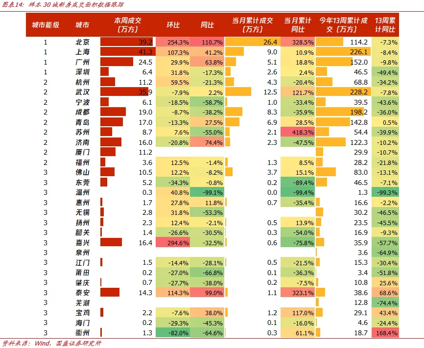 本周30个城市新房成交面积为301.1万平方米,环比提升31.3%,同比下降5.6%,其中样本一线城市的新房成交面积为111.3万方,环比+103.7%,同比+57.9%;样本二线城市为128.7万方,环比+2.7%,同比-8.3%;样本三线城市为61.1万方,环比+23.6%,同比-43.5%。3月累计新房成交面积方面,样本30城共计91.5万方,同比18.8%;一线城市为43.2万方,同比104.1%;二线城市为38.7万方,同比5.1%;三线城市为9.6万方,同比-49.4%。从今年累计13周新房成交面积同比看,样本30城共计1841.7万方,同比-26.5%;一线城市为538.7万方,同比-14.5%;二线城市为912.3万方,同比-22.0%;三线城市为390.7万方,同比-44.5%。其中一线城市中,北京(-7.3%)、上海(-8.4%)、广州(-9.8%)、深圳(-49.4%)。
