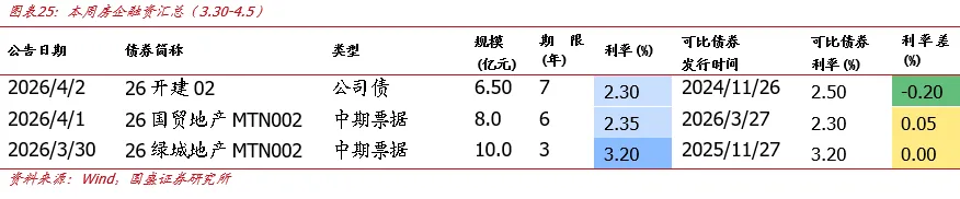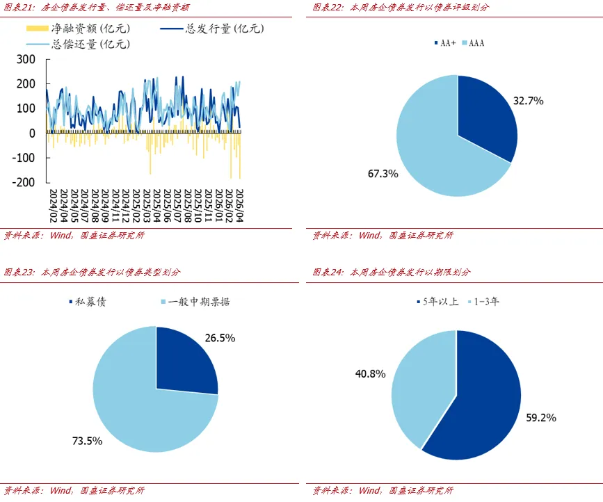 根据wind统计数据,本周(3.30-4.5)共发行房企信用债3只,环比减少11只;发行规模共计24.50亿元,环比减少78.51亿元,总偿还量209.57亿元,环比增加57.71亿元,净融资额为-185.07亿元,环比减少136.22亿元。主体评级方面,本周房企债券发行已披露的主体评级以AAA(67.3%)为主要构成。债券类型方面,本周房企债券发行以一般中期票据(73.5%)为主要构成。债券期限方面,本周以5年以上(59.2%)的债券为主。融资成本方面,本周发行利率有升有降。其中26开建02 7年期公司债(-20bp)的债券利率较公司之前发行的同类型同期限的可比债券利率有所下降。