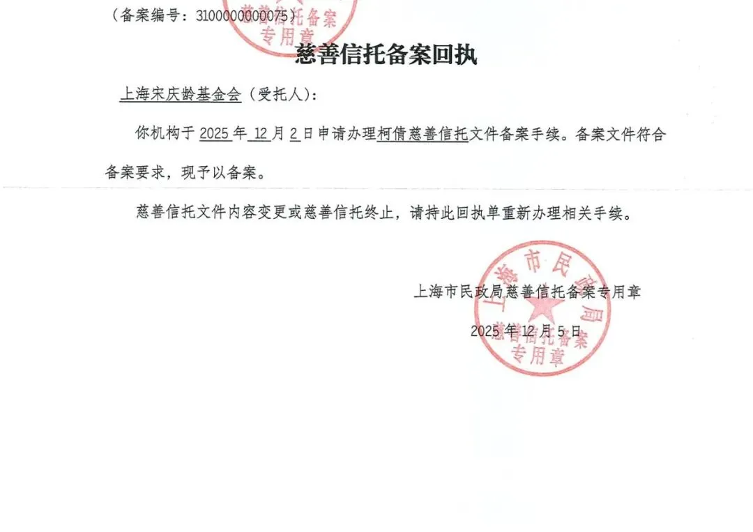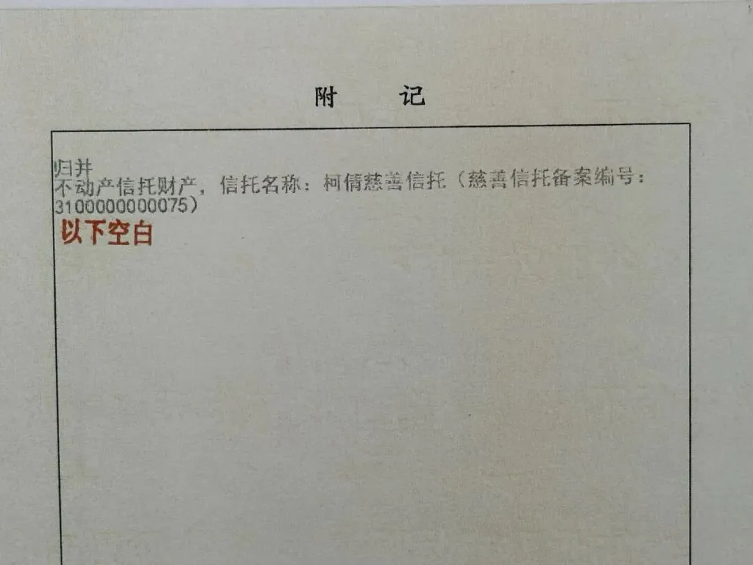 在经市民政局依法备案后,“柯倩慈善信托”已于近期正式生效。备案完成后,上海宋庆龄慈善基金会依规完成了房产证的“信托财产”注记及第三方托管,至此,“柯倩慈善信托”完成了不动产过户、信托备案、财产注记全流程闭环,成为上海首例可复制、可推广的不动产遗嘱慈善信托样本。