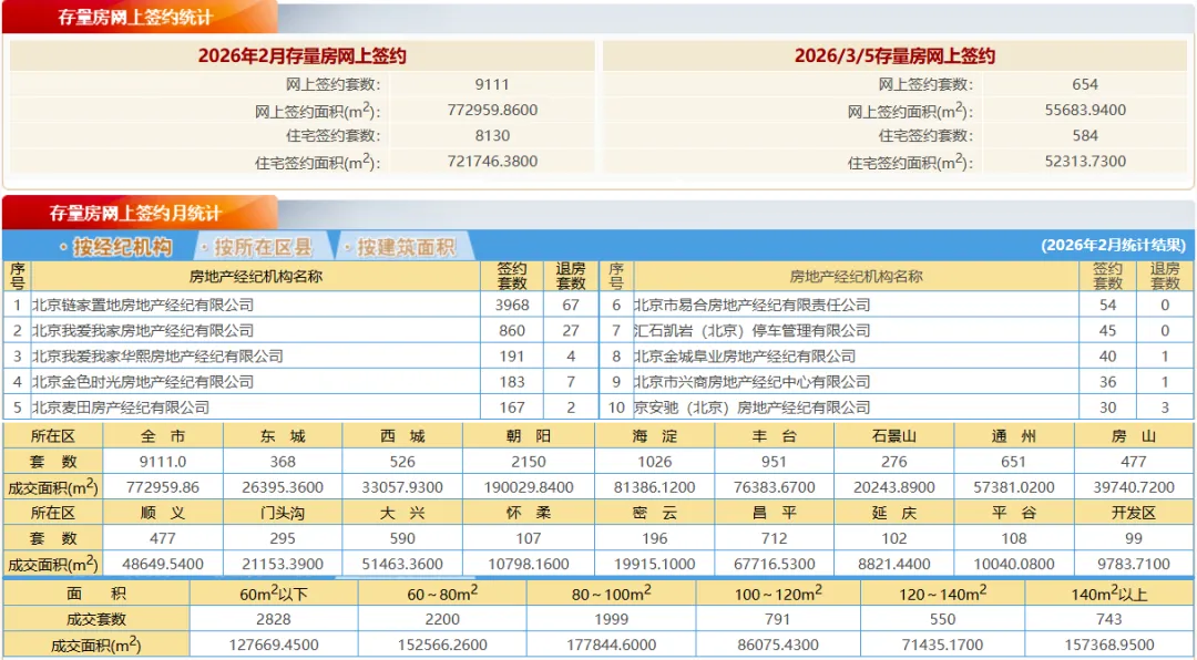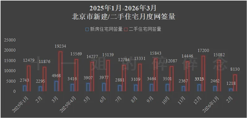 ps:因其北京成交量市占率约5成(实际更高)故使用2023.1.1-2026.3.31北京二手房挂牌量走势2024.9.1-2026.3.31北京二手房挂牌量走势2025年1月-2026年3月北京新建、二手住宅月网签量2024.1-2025.12北京新建、二手住宅月度网签量2026年2月北京二手房网签明细:各区域、各机构、各面积段网签量注:我的年度数据为每月度数据累加,计数之后的退房量无法刨除,对比最下方的官方年度数据可知。