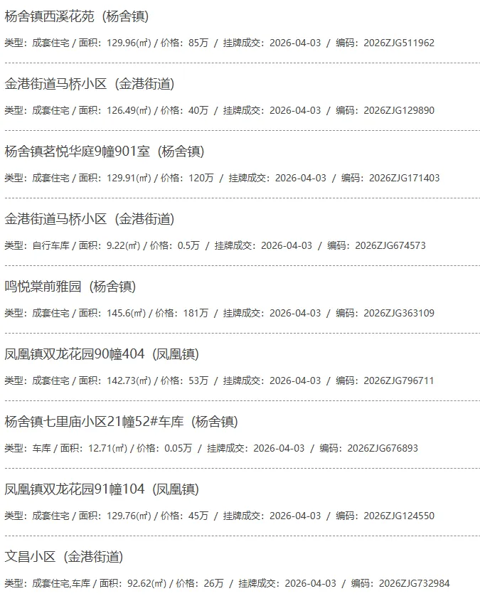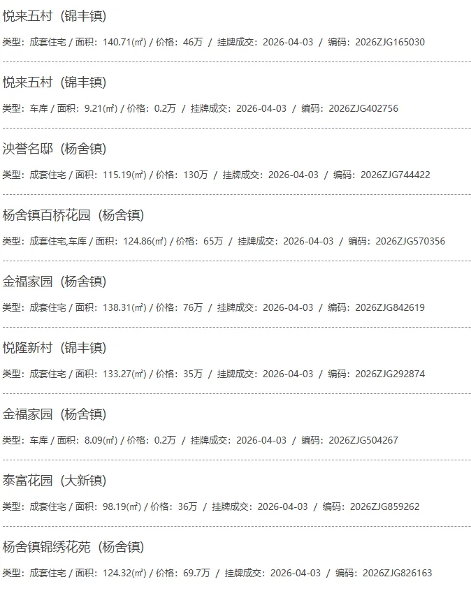 根据张家港房产网(www.zjgzf.cn)整理,(2026-04-03至2026-04-03)总共32套二手房网签挂牌成交(含自行车库及汽车库),数据根据住建局官方网签平台整理,并已同步至各对应小区的成交明细,特别提醒:此处数据及各小区成交数据中凡标注(来自网签挂牌)的,均是根据政府网签挂牌系统整理,价格可能不准,请谨慎采信;并仅作为您买房卖房的参考而非决定依据。以下为数据明细: