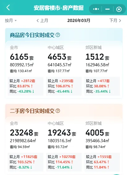 3月成交数据: 二手住宅过户套数高达23248套,环比激增103.5%,创下自2025年5月以来的月度数据新高;成交面积约219.9万平方米,环比增长101.8%,增幅明显。