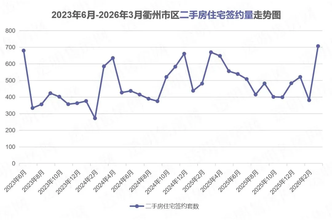 据衢州透明售房网数据统计,2026年3月衢州市区二手房住宅共成交707套,同比去年上涨5.52%,环比上月大涨85.56%。